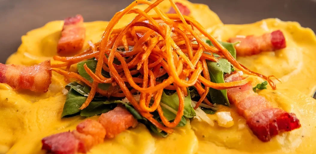 If youβre craving something rich, cozy and fall-like, our Wild Mushroom & Truffle Ravioli is the perfect choice. The pasta is stuffed with a decadent blend of earthy wild mushrooms and truffle, then tossed in a roasted butternut cream sauce that just feels like autumn. Since we agree everything is better with bacon, we added that in with a little fresh arugula and a sprinkling of parmesan for a salty finish. Itβs hearty, itβs elegant, and itβs the kind of dish that makes you want to linger over every forkful.